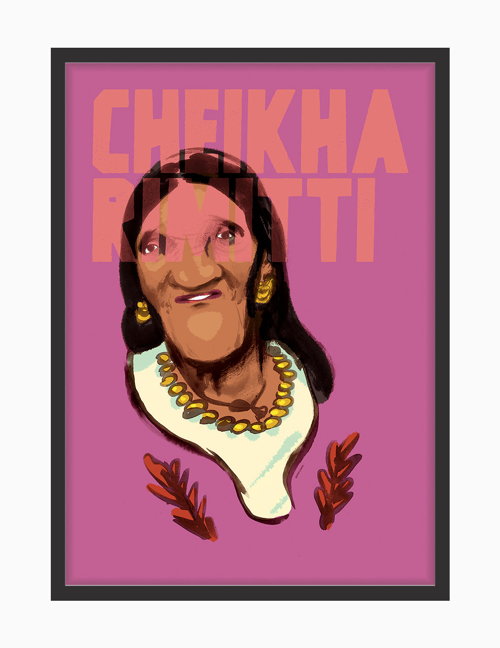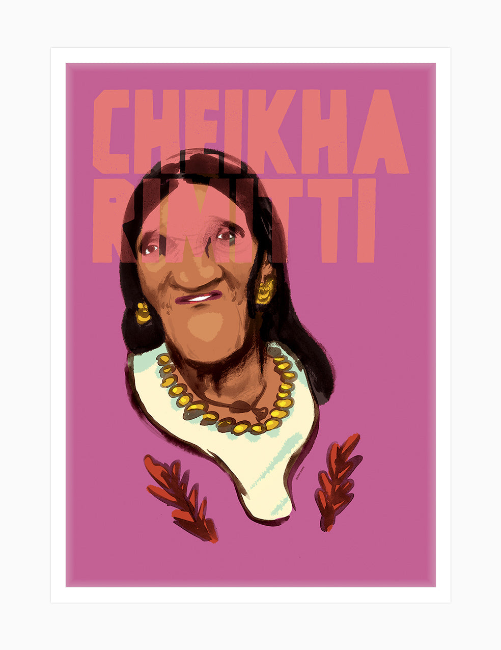 "Cheikha Rimitti" by Shennawy honors Algeria's pioneering rai singer, depicting her traditional jewelry and bold expression that embodied women's defiant voices in North African music.